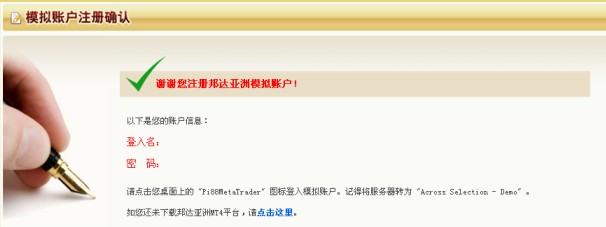 在您成功注册模拟帐户后, 您将会收到您的登入信息。请您点击“点击这里”,下载并安装邦达亚洲MT4软件。 或是您可以通过系统自动发送给您的账户信息邮件获取MT4软件的下载链接。