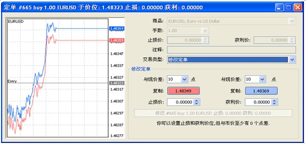 点击“修改或删除定单”选项,将弹出以下窗口,然后您就可以添加止损价以及获利价。当您设置的限价单与市价相差5个点之内,您将无法修改或删除有关限价单。。