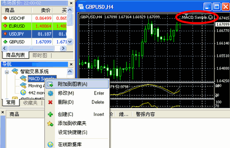 启用智能交易系统,客户需要点击此按钮,则点击此按钮以表示关闭智能交易系统功能。 开启“智能交易系统”后,客户需要选中智能交易系统并且使用鼠标拖拽技术附加在图表上。成功启用的“智能交易系统”会出现一个明显的附件微笑图标显示在图形右上角;或使用导航窗口,单击目标头寸,然后点击右键,这时将会出现一个选项菜单,客户需要选择“附加到图表”。