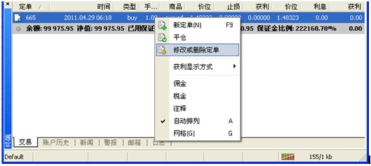 客户需要执行定单,然后在终端窗口,单击目标头寸,然后点击右键,这时将会出现一个选项菜单,客户需要选择“修改或删除定单”。